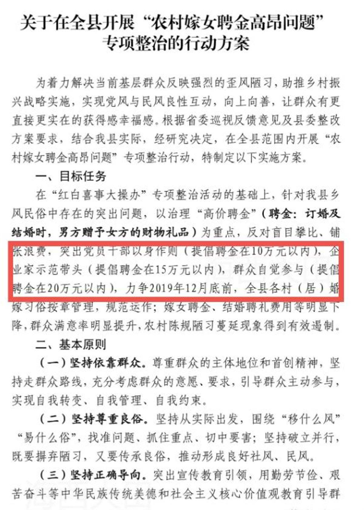 2019年5月,大田縣委辦公室就印發(fā)《關于在全縣開展“農(nóng)村嫁女聘金高昂問題”專項整治的行動方案》的通知。方案內(nèi)容有,針對該縣鄉(xiāng)風民俗中存在的突出問題,以治理“高價聘金”為重點,反對盲目攀比、鋪張浪費,突出黨員干部以身作則(提倡聘金在10萬元以內(nèi)),企業(yè)家示范帶頭(提倡聘金在15萬元以內(nèi)),群眾自覺參與(提倡聘金在20萬元以內(nèi)),力爭在2019年12月底前,結婚聘禮費用等明顯下降。