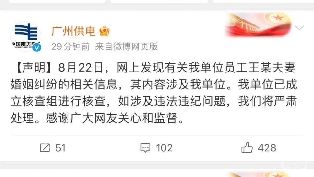 8月22日晚間,廣州供電局官方社交賬號(hào)發(fā)布聲明稱:“8月22日,網(wǎng)上發(fā)現(xiàn)有關(guān)我單位員工王某夫妻婚姻糾紛的相關(guān)信息,其內(nèi)容涉及我單位。我單位已成立核查組進(jìn)行核查,如涉及違法違紀(jì)問(wèn)題,我們將嚴(yán)肅處理。感謝廣大網(wǎng)友關(guān)心和監(jiān)督。”