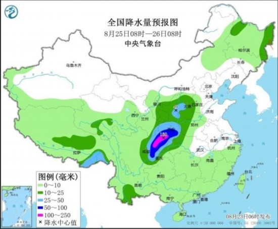8月25日08時至26日08時,內(nèi)蒙古河套地區(qū)、黑龍江東部、吉林東部、甘肅東部、寧夏、四川中東部、重慶、河南西部、湖北西部、貴州北部、云南南部、廣東南部以及西藏東部、青海南部等地的部分地區(qū)有中到大雨,其中,陜西南部、四川東北部、重慶西部和北部等地的部分地區(qū)有暴雨或大暴雨(100~180毫米)。遼東半島、山東半島等地的部分地區(qū)有4~5級風。