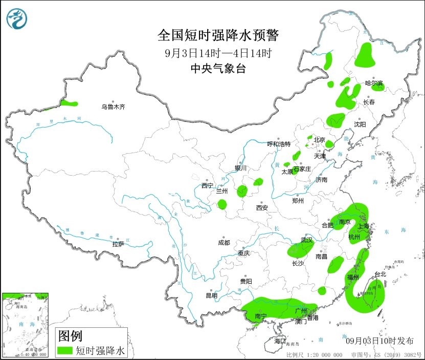 預(yù)計(jì)9月3日14時(shí)至4日14時(shí),內(nèi)蒙古東南部、吉林西部、遼寧西部、山西中部、河北中部和東北部以及福建東部和西北部、廣西南部和東南部沿海、臺(tái)灣島等地的部分地區(qū)將有8-10級(jí)雷暴大風(fēng)或冰雹天氣,局地可達(dá)11級(jí)以上;內(nèi)蒙古東部、黑龍江西部、吉林西部、遼寧西部、甘肅南部、山西中部、河北西部和東北部、江蘇中南部、安徽東部、上海、浙江北部、福建東部和西北部、廣西南部、廣東西南部、臺(tái)灣島等地的部分地區(qū)將有短時(shí)強(qiáng)降水天氣,最大小時(shí)雨量20-50毫米,局地可達(dá)70毫米以上。