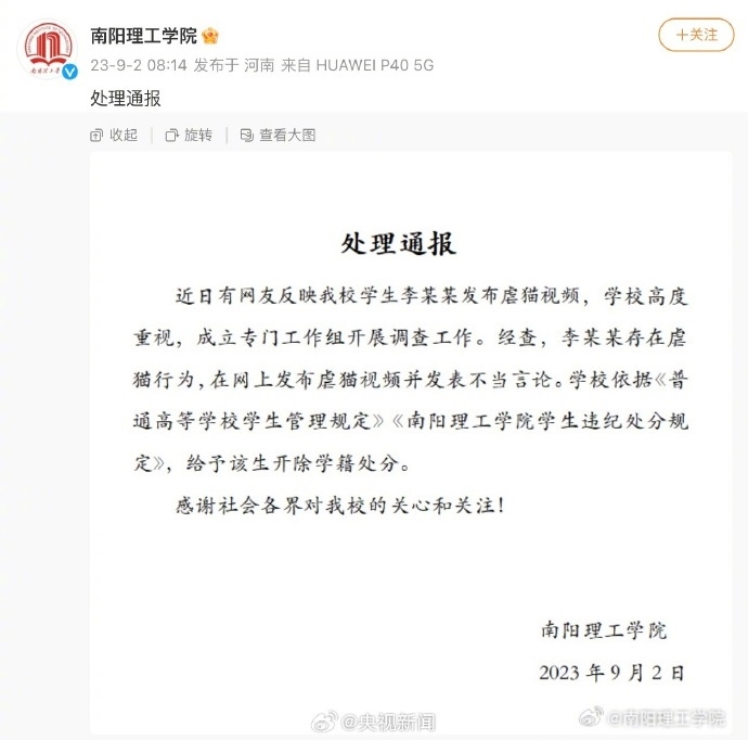 ·南陽理工學(xué)院再通報(bào):對涉事虐貓學(xué)生給予開除學(xué)籍處分。