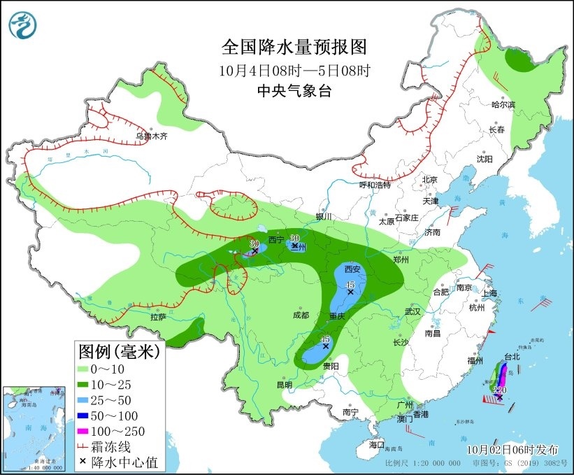 10月3日08時(shí)至4日08時(shí),黑龍江西南部、遼寧東部、西藏東南部、青海東部、甘肅東南部、陜西中南部、重慶北部以及臺灣島北部等地部分地區(qū)有中到大雨,其中,臺灣島北部和東部等地部分地區(qū)有暴雨(50~95毫米)。內(nèi)蒙古東南部、西藏北部等地部分地區(qū)有4~6級風(fēng)。渤海、渤海海峽、黃海大部、東海北部將有6~7級風(fēng)、陣風(fēng)8級,東海西南部海域風(fēng)力將有7~8級風(fēng)、陣風(fēng)9級。臺灣以東洋面將有7~8級轉(zhuǎn)9~10級風(fēng)、陣風(fēng)9級轉(zhuǎn)11級(見圖2)。