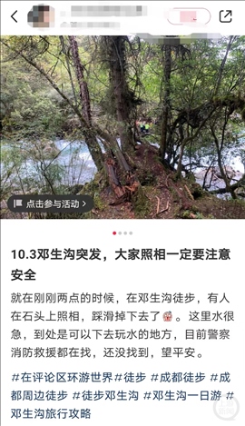 有游客介紹,鄧生溝非常漂亮,不少人前往都會打卡拍照,但不建議靠近水邊,因?yàn)樗魍募保曳浅1?。近期,除了該女游客溺水身亡,還有游客走失,所幸被尋回。