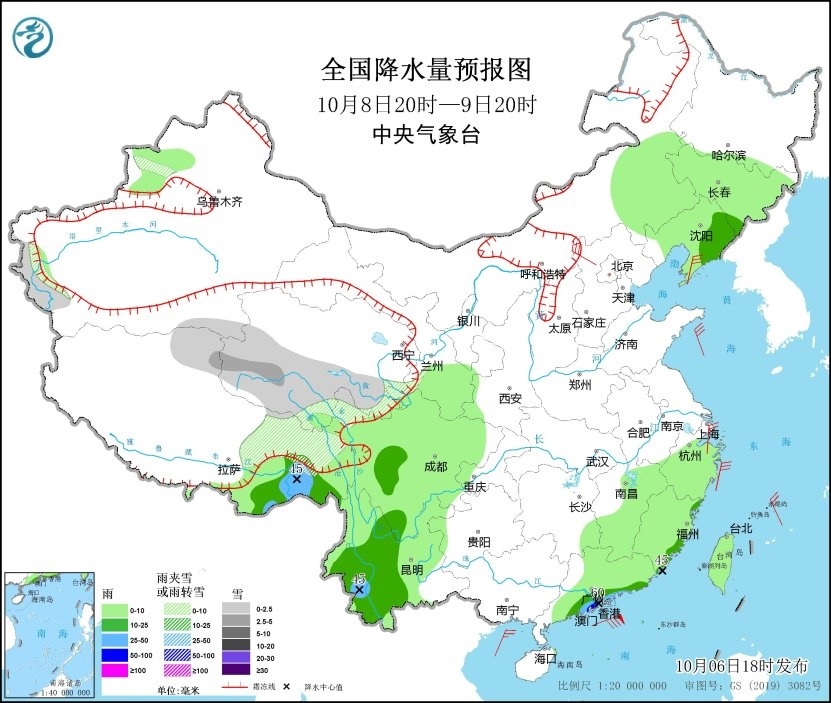 10月8日20時(shí)至9日20時(shí),新疆西南部、青海中南部、西藏北部等地的部分地區(qū)有小到中雪或雨夾雪;西藏東南部、四川西南部、云南中部和南部、廣東和福建的沿海地區(qū)以及遼寧東部等地的部分地區(qū)有中到大雨,其中廣東南部沿海地區(qū)局地有暴雨(50~60毫米)。東海南部海域、臺灣海峽6~8級風(fēng)、陣風(fēng)9~10級,南海北部海域、北部灣偏北海域有7~9級風(fēng)、陣風(fēng)10~11級(見圖3)。