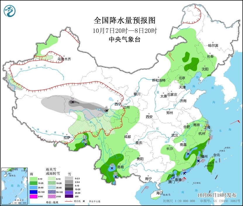 10月6日20時(shí)至7日20時(shí),新疆南疆盆地西部沿山地區(qū)、青海南部、西藏東部等地有小到中雪或雨夾雪;西藏東南部、四川盆地東部和南部、云南中東部、福建中南部、廣東東部、海南島南部、臺灣島西部等地部分地區(qū)有中到大雨,其中,廣東東部和福建南部沿海等地局部地區(qū)有暴雨(50~65毫米)。內(nèi)蒙古中東部、遼東半島、浙江東部沿海等地部分地區(qū)有4~6級風(fēng),西藏中部部分地區(qū)有6~7級風(fēng)。臺灣海峽將有6~7級、陣風(fēng)8級的東北風(fēng),南海東北部海域?qū)⒂?~9級、陣風(fēng)10級的偏北風(fēng)(見圖1)。
