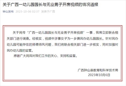 ·廣西鐘山縣通報幼兒園園長與男子開房視頻:系某民辦幼兒園園長,將進一步核實師德師風問題。