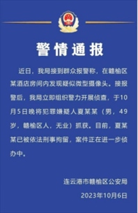 ·連云港警方通報酒店房間發(fā)現(xiàn)微型攝像頭:49歲犯罪嫌疑人夏某某已被刑拘。