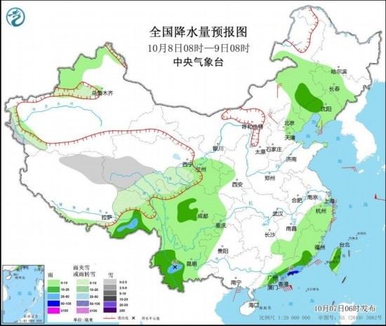 圖2 全國降水量預(yù)報(bào)圖(10月8日08時(shí)-9日08時(shí))