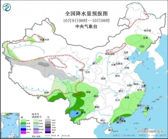 圖1 全國(guó)降水量預(yù)報(bào)圖(10月8日08時(shí)-9日08時(shí))