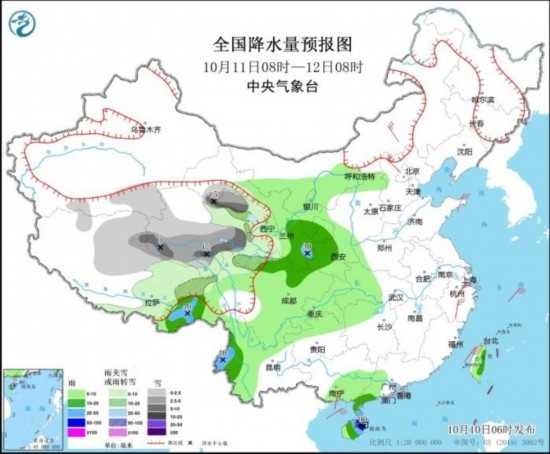 10月11日08時(shí)至12日08時(shí),甘肅西部、新疆南部、西藏北部和東部、青海大部、四川西北部等地部分地區(qū)有小到中雪或雨夾雪,其中,青海北部和南部局地有大雪或暴雪。西藏東南部、甘肅東部、陜西西南部、四川北部、云南西北部、雷州半島、海南島大部、臺(tái)灣東部等地部分地區(qū)有中到大雨,其中海南島東北部等地局地有暴雨(50~90毫米)。內(nèi)蒙古中部、河北西北部、山東半島、浙江、廣西南部等地部分地區(qū)有4~5級(jí)風(fēng)。東海南部、臺(tái)灣海峽、南海北部海域?qū)⒂?~7級(jí)、陣風(fēng)8~9級(jí)風(fēng)。