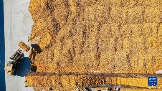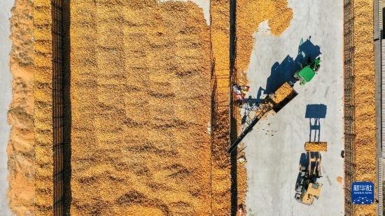 10月19日,在吉林省公主嶺市友忠種植農(nóng)民專業(yè)合作社,農(nóng)民將收獲的玉米放入科學(xué)儲糧倉(無人機照片)。