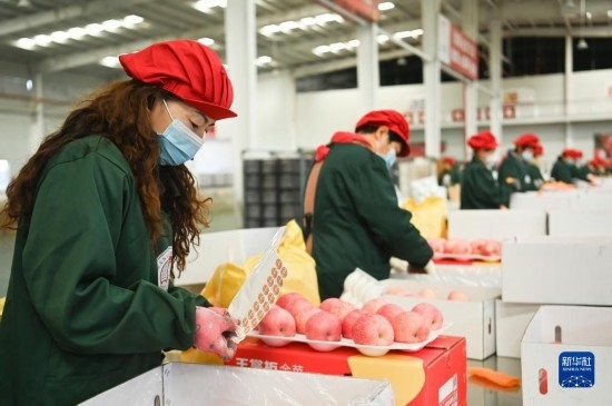 10月20日,工作人員在延安市洛川縣一家果業(yè)企業(yè)打包蘋果。