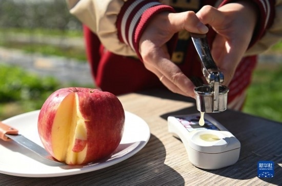 10月20日,西北農(nóng)林科技大學(xué)科研人員在洛川蘋果試驗站檢測蘋果品質(zhì)。