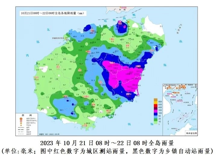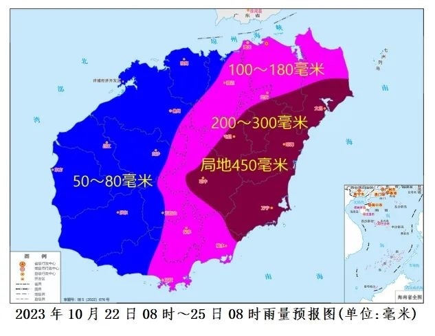 預(yù)計(jì),10月22日08時(shí)~25日08時(shí)各地累積雨量:文昌、瓊海、瓊中、屯昌和萬寧200~300毫米、局地450毫米,??凇⒊芜~、定安、保亭、陵水和三亞100~180毫米,其余市縣50~80毫米。