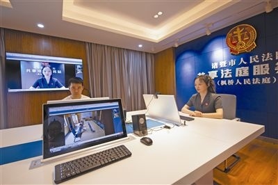 圖③:智慧建設(shè)。圖為諸暨法院楓橋人民法庭在審理一起民間糾紛案件中,因當(dāng)事人一方遠(yuǎn)在外地,故組織雙方線上開庭,當(dāng)事人表示相當(dāng)滿意。