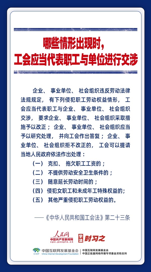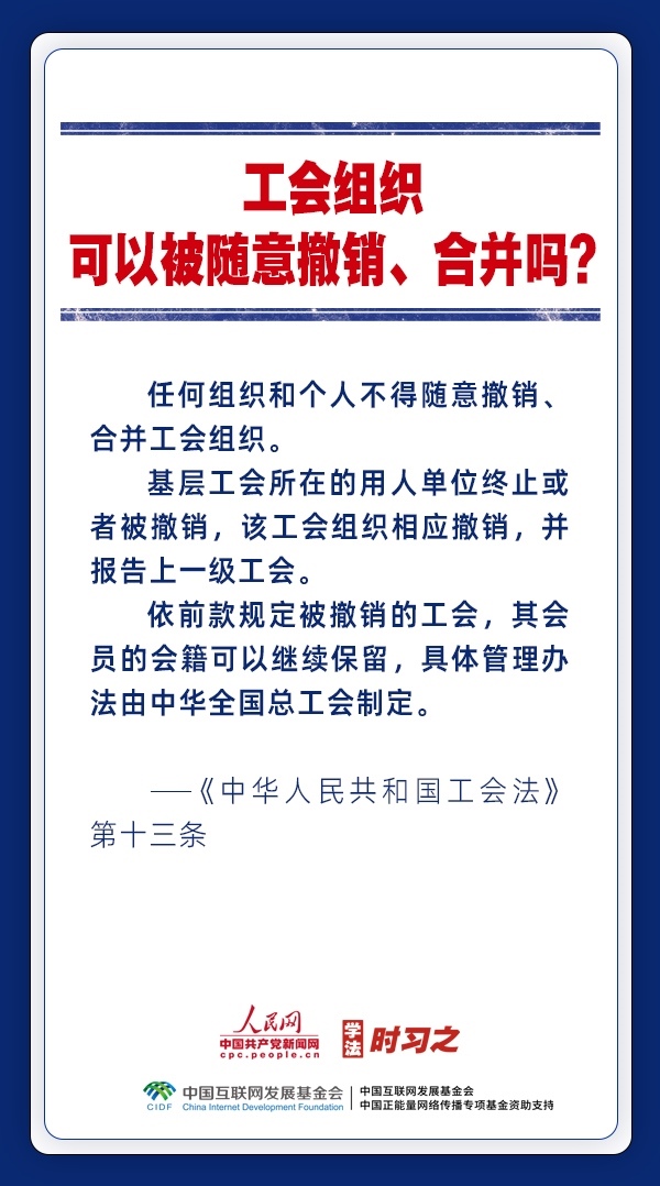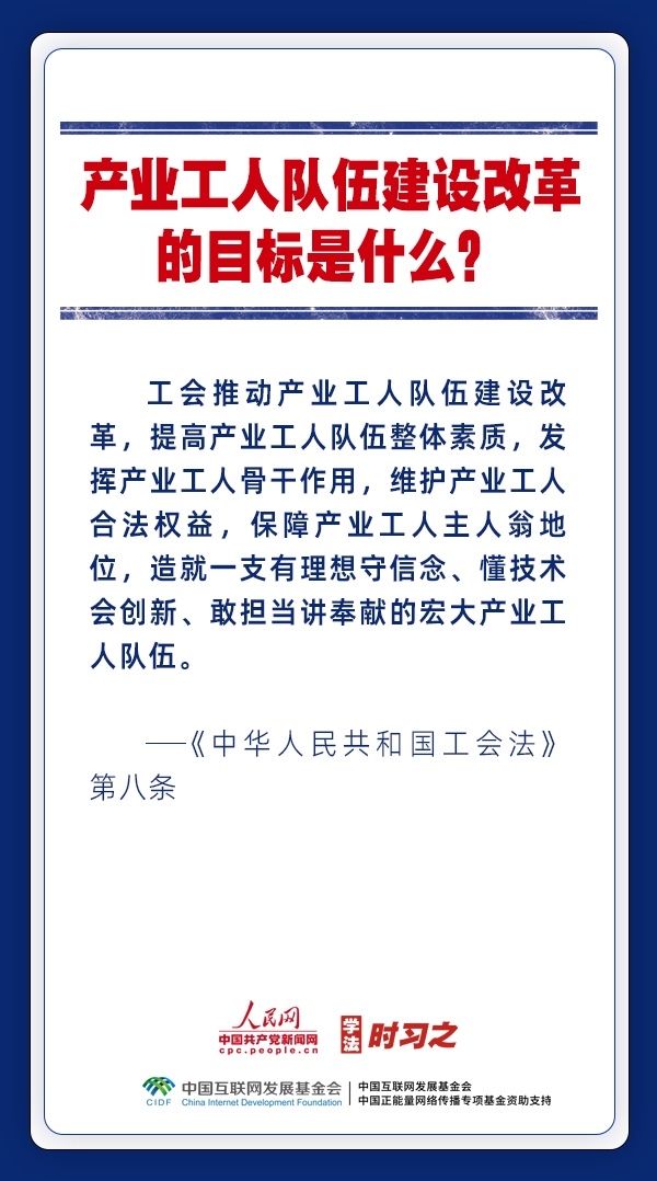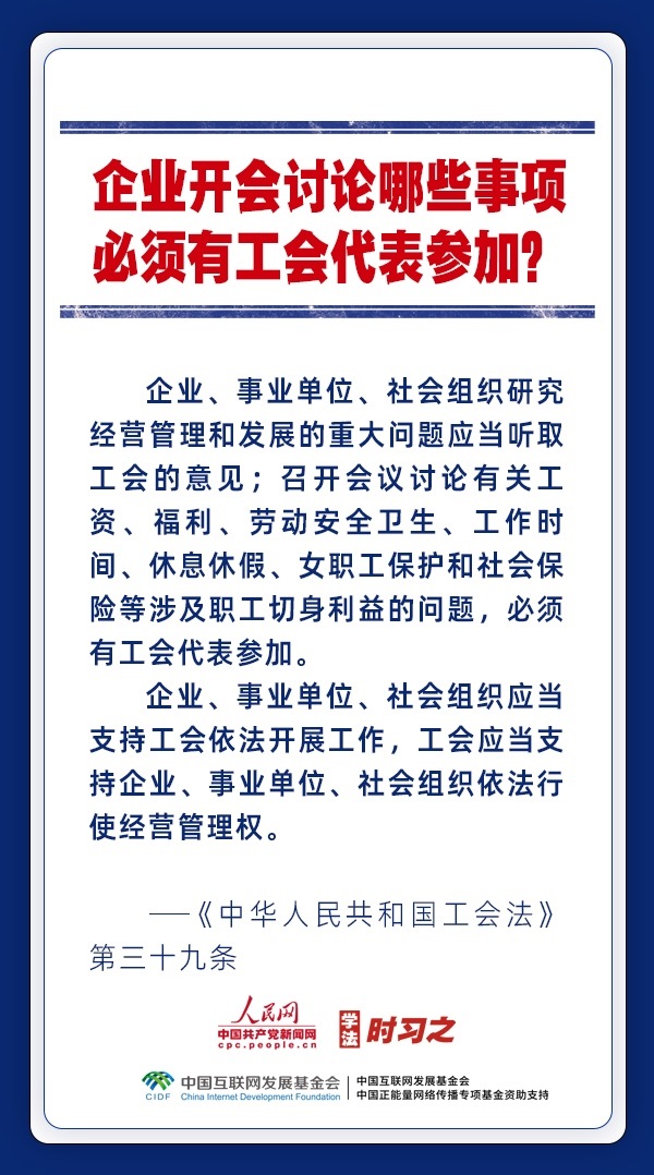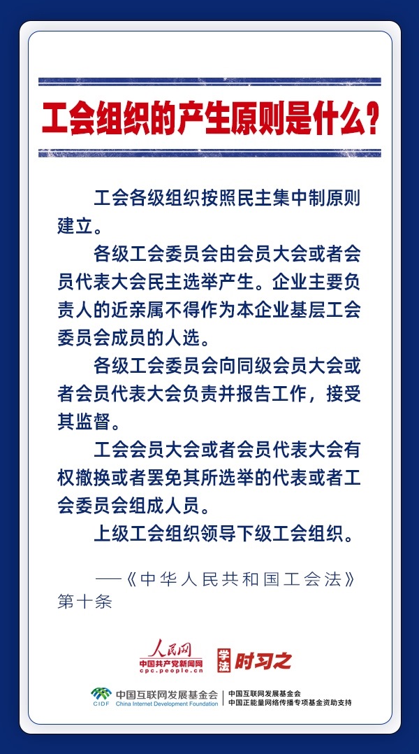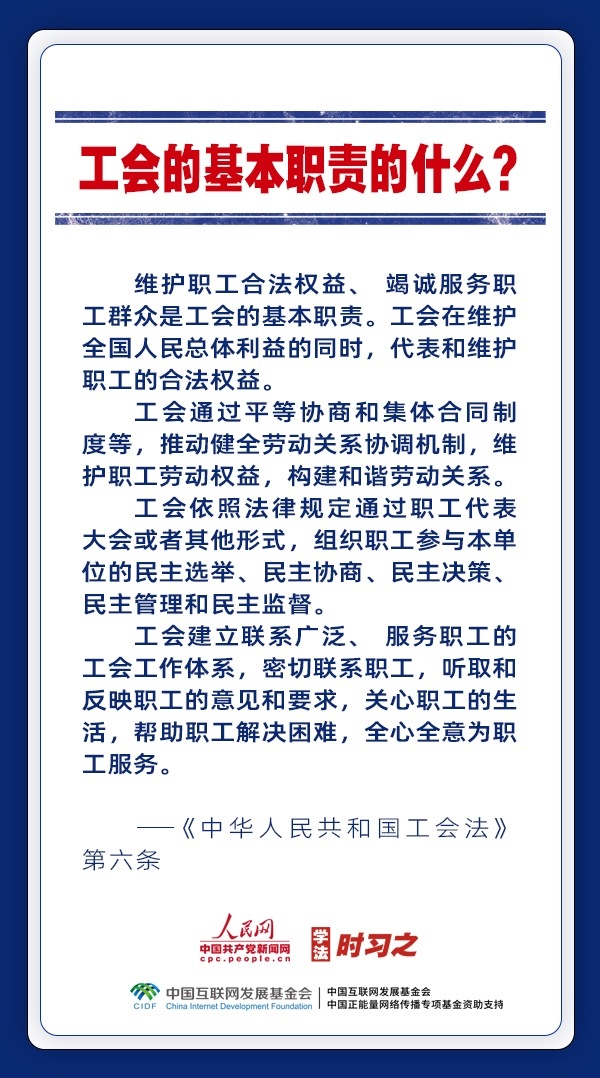 日前,中華全國(guó)總工會(huì)新一屆領(lǐng)導(dǎo)班子產(chǎn)生。黨和政府歷來(lái)重視工會(huì)的地位作用,十分注重加強(qiáng)工會(huì)法律制度建設(shè),專門為廣大職工制定了《中華人民共和國(guó)工會(huì)法》。網(wǎng)約車司機(jī)、快遞員、外賣配送員能入工會(huì)嗎?產(chǎn)業(yè)工人隊(duì)伍建設(shè)改革的目標(biāo)是什么?企業(yè)開(kāi)會(huì)討論哪些事項(xiàng)必須有工會(huì)代表參加?一起來(lái)了解。
