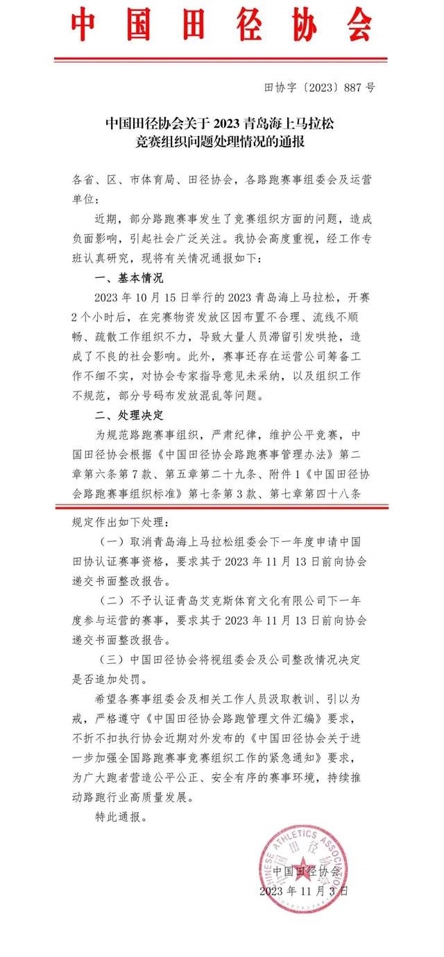 央視網(wǎng)消息:據(jù)“中國(guó)馬拉松平臺(tái)”官微消息,近日,部分路跑賽事出現(xiàn)了一些競(jìng)賽組織問題,引發(fā)社會(huì)廣泛關(guān)注,造成了不良的社會(huì)影響。中國(guó)田徑協(xié)會(huì)高度重視、全面調(diào)查,依據(jù)事實(shí)和路跑賽事管理規(guī)定,從加強(qiáng)競(jìng)賽組織,壓實(shí)各方主體責(zé)任,提示行業(yè)風(fēng)險(xiǎn)隱患的角度,對(duì)相關(guān)單位和人員進(jìn)行了相應(yīng)處理?,F(xiàn)將處理情況通報(bào)如下:
