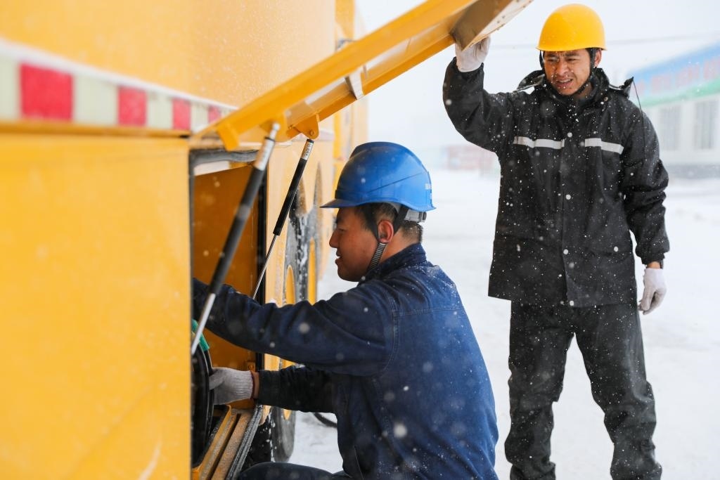 6日,國網(wǎng)長春供電公司工作人員在雪中保障供電。新華社記者顏麟蘊(yùn) 攝