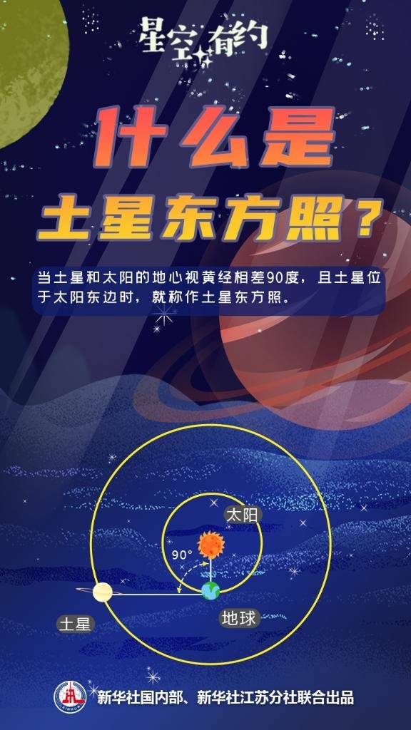 當(dāng)土星和太陽的地心視黃經(jīng)相差90度,且土星位于太陽東邊時,就稱作土星東方照。如果可以俯視太陽系的平面,此時你會看到太陽、地球、土星形成了一個直角,地球處于直角的頂點。