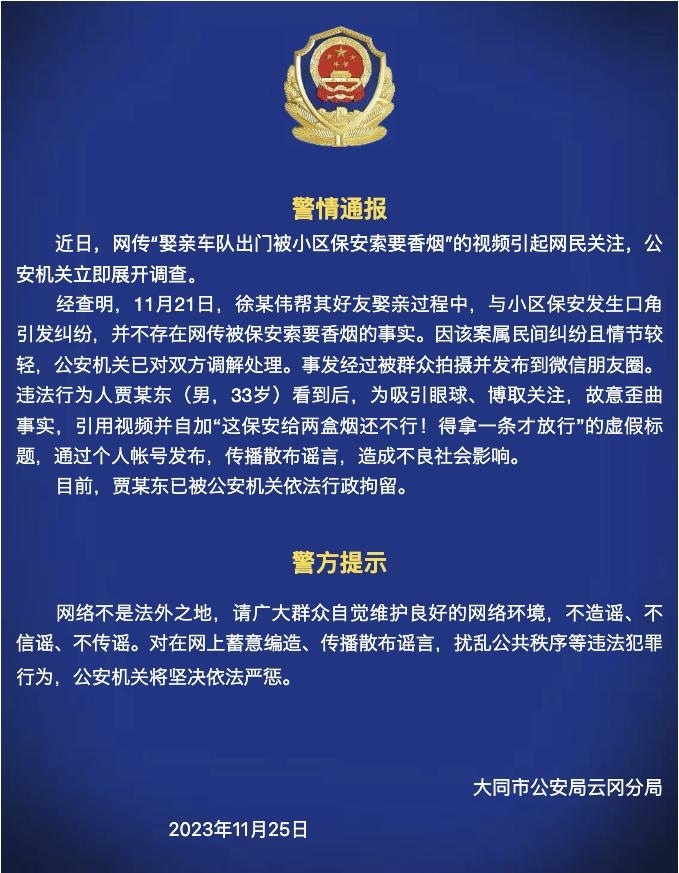 ·大同警方:網(wǎng)傳“娶親車隊出門被小區(qū)保安索要香煙”系謠言。