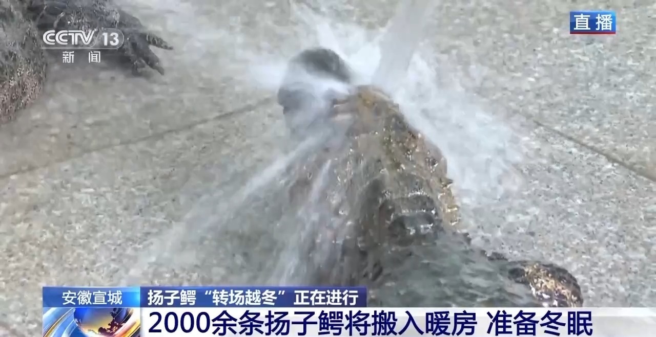 由于今年的溫度比較高,與往年相比,轉(zhuǎn)場越冬推遲了十天左右。轉(zhuǎn)場是按照從小到大的順序。今天是第一天,率先搬家的主要是7歲以下的幼鱷,它們對環(huán)境的適應(yīng)能力更弱一些,需要盡快搬進(jìn)室內(nèi)。在搬進(jìn)暖房之前,揚子鱷需要先進(jìn)行沖洗、消毒?!鞍布摇焙?,越冬房的溫度會保持在10℃左右,并且有工作人員定期打掃、保濕,確保揚子鱷安全過冬。