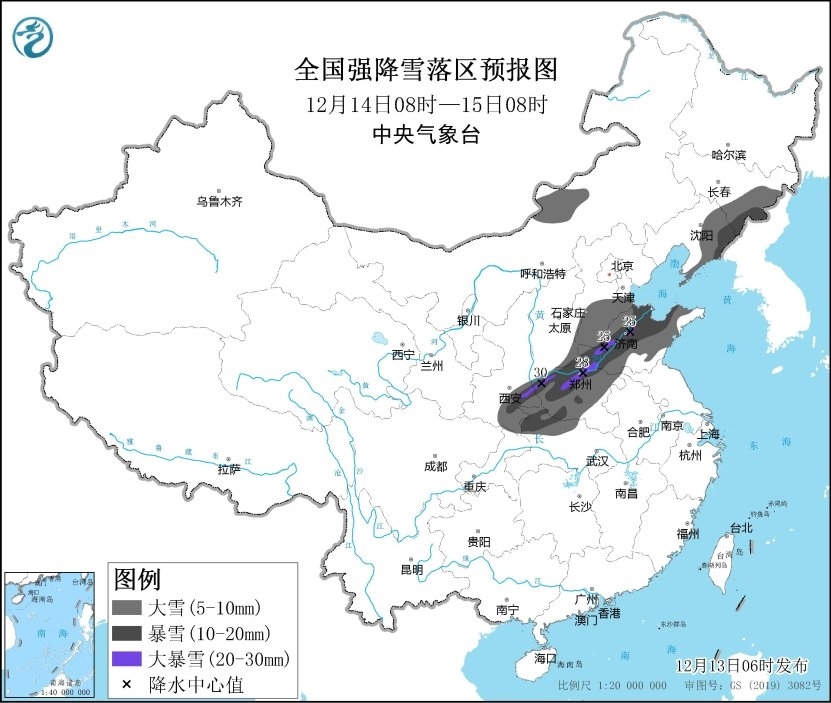 12月14日08時至12月15日08時,陜西東南部、湖北西北部、河南中西部和北部、山西南部、河北南部、山東大部、遼寧東部、吉林東部以及內(nèi)蒙古中部等地的部分地區(qū)有大到暴雪,其中,陜西東南部、河南北部、山東西北部等地部分地區(qū)有大暴雪(20~30毫米)。上述部分地區(qū)新增積雪深度8~12厘米,局地可達15-20厘米以上。