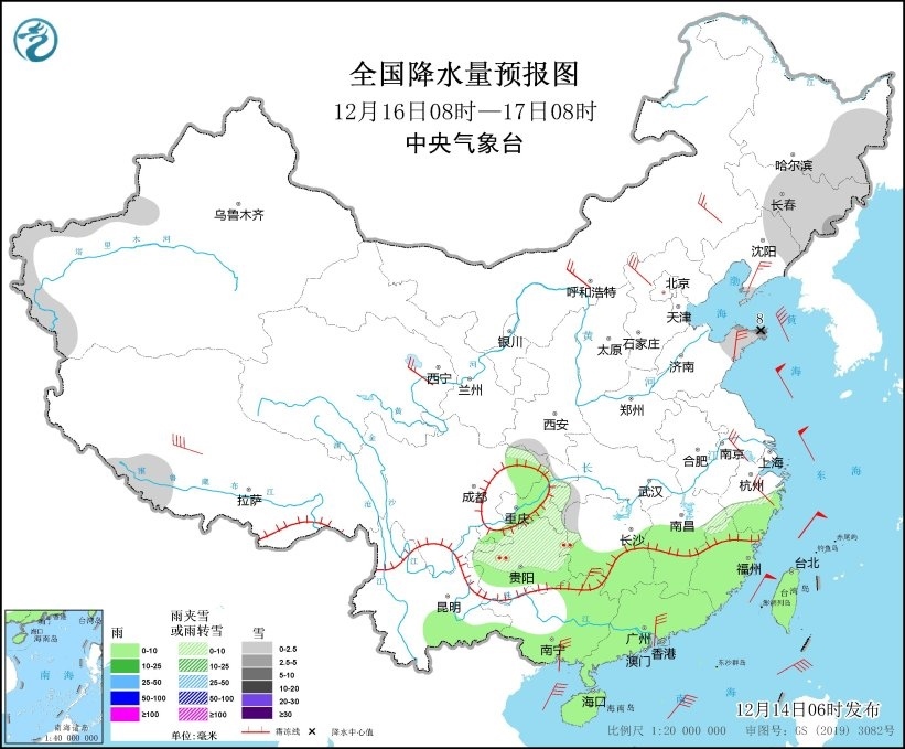 12月15日08時(shí)至16日08時(shí),西北地區(qū)東南部、內(nèi)蒙古東部、東北地區(qū)中南部、華北南部、黃淮、江淮西部、江漢大部、川西高原北部、四川盆地北部、貴州西部等地部分地區(qū)有小到中雪或雨夾雪,其中,吉林東部、遼寧東北部、山東半島北部等地部分地區(qū)有大到暴雪(10~11毫米)。貴州等地局地有凍雨。江淮東部、江南東部、福建大部、廣東北部等地部分地區(qū)有中到大雨(25~40毫米)。西北地區(qū)東部、內(nèi)蒙古中東部、吉林、遼寧、華北、黃淮北部和西部、江漢東部、江南北部和東部、華南沿海地區(qū)等地部分地區(qū)有4~6級風(fēng)(見圖6)。