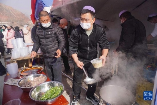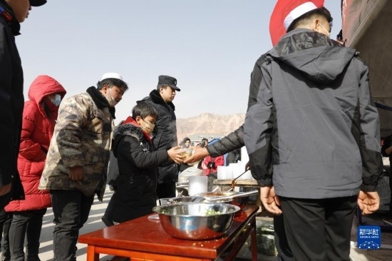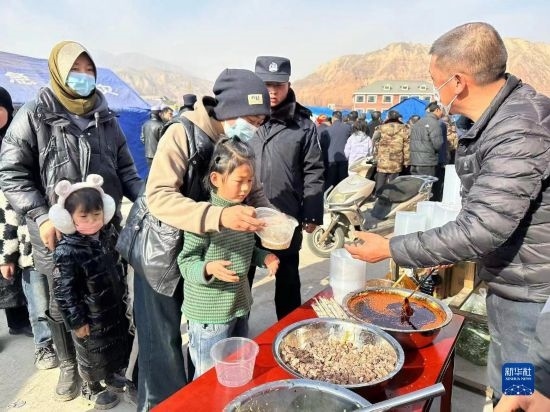 12月19日,在甘肅臨夏積石山縣大河家鎮(zhèn)大河村安置點(diǎn),受災(zāi)群眾領(lǐng)取愛(ài)心牛肉面。