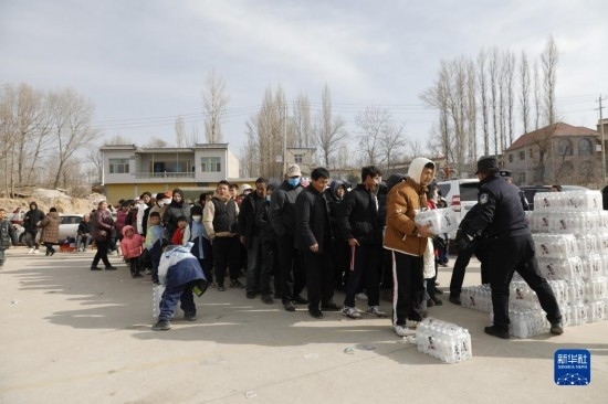 12月19日,在甘肅臨夏積石山縣大河家鎮(zhèn)大河村安置點(diǎn),受災(zāi)群眾領(lǐng)取礦泉水。