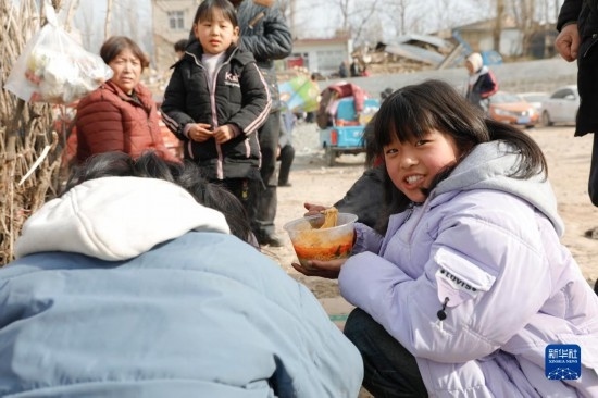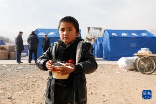 12月19日,在甘肅臨夏積石山縣大河家鎮(zhèn)大河村安置點(diǎn),小朋友在吃愛(ài)心牛肉面。
