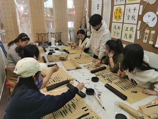 近日,陜西西安,一群年輕人在“城市緩沖區(qū)”夜校開(kāi)設(shè)的書(shū)法課上學(xué)習(xí)。受訪者供圖