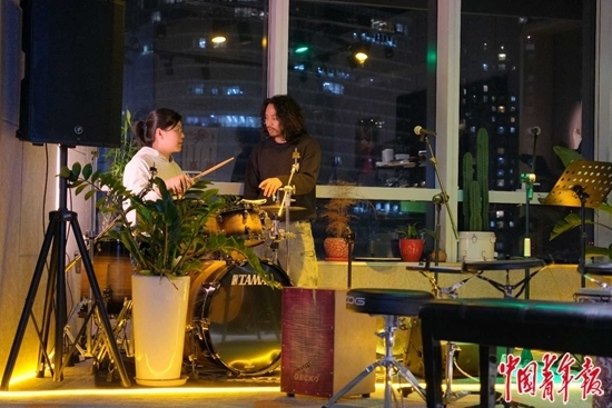 12月4日,北京市朝陽(yáng)區(qū)望京的一處寫(xiě)字樓里,夜校老師、樂(lè)隊(duì)鼓手老萬(wàn)(右)在為一名學(xué)員講授架子鼓課程,她是一名零基礎(chǔ)學(xué)員。中青報(bào)·中青網(wǎng)見(jiàn)習(xí)記者 田嘉碩/攝