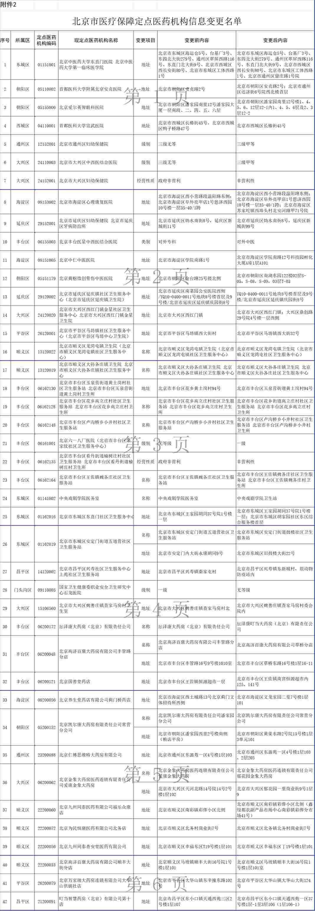 北京中醫(yī)藥大學(xué)東直門醫(yī)院等42家定點(diǎn)醫(yī)藥機(jī)構(gòu)申請(qǐng)信息變更,經(jīng)市、區(qū)醫(yī)保經(jīng)辦機(jī)構(gòu)審核,現(xiàn)決定對(duì)上述42家定點(diǎn)醫(yī)藥機(jī)構(gòu)的有關(guān)信息予以變更(見附件2)。
