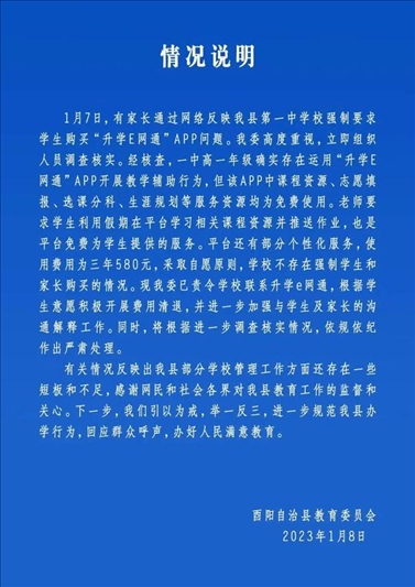 ·重慶一中學通知學生使用收費App交作業(yè)?教委回應:非強制,正退費。