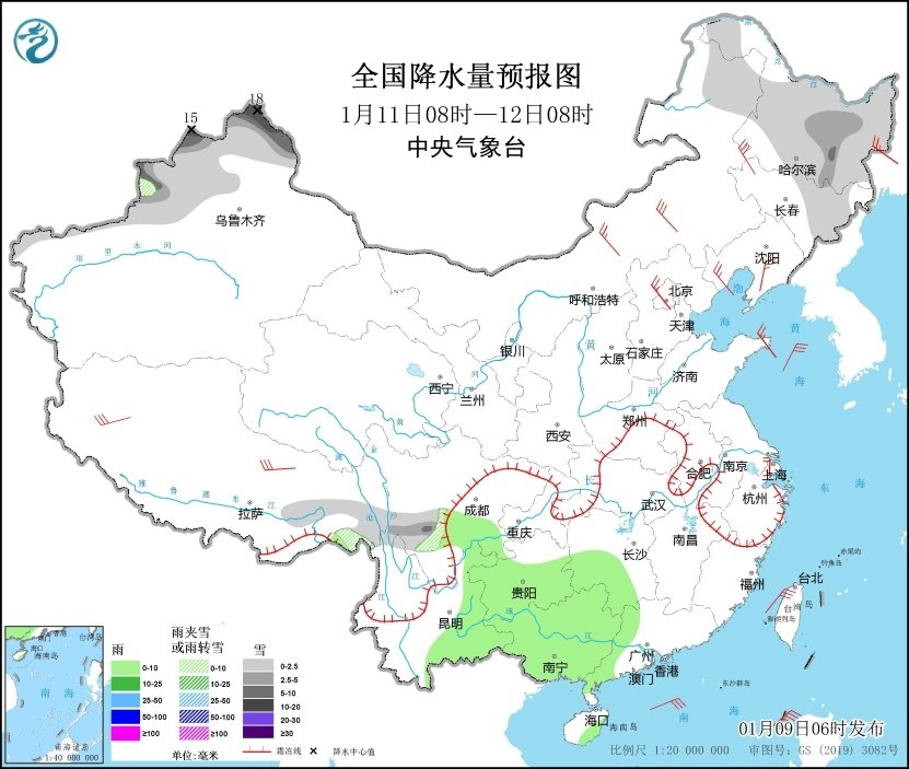 1月11日08時至12日08時,新疆北部、內(nèi)蒙古東北部、黑龍江、吉林東部、川西高原南部等地的部分地區(qū)有小到中雪或雨夾雪,其中新疆阿勒泰、塔城、伊犁河谷等地的部分地區(qū)有大雪,局地暴雪(10~18毫米);四川南部、湖南西南部、貴州、云南東部、廣西等地的部分地區(qū)有小雨。內(nèi)蒙古中東部、東北地區(qū)南部、華北東部、山東半島、西藏等地的部分地區(qū)有4~6級風(fēng);黃海北部、臺灣海峽、臺灣以東洋面、巴士海峽、南海東北部和西南部等海域有6~7級風(fēng)、陣風(fēng)8~9級(見圖3)。