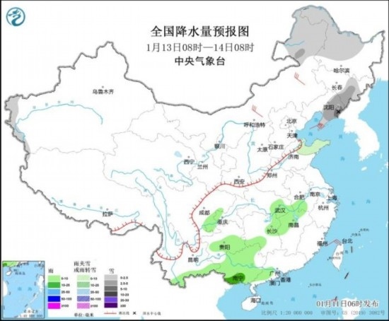 全國降水量預(yù)報(bào)圖(1月13日08時(shí)-14日08時(shí))
