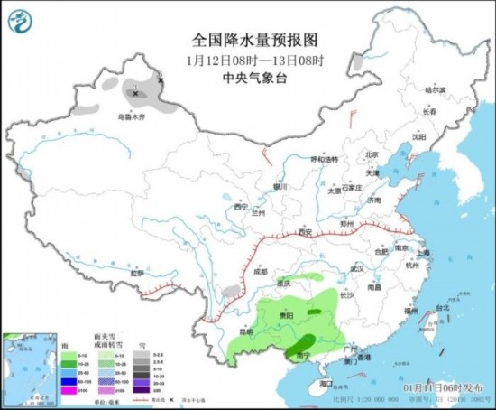 全國降水量預(yù)報(bào)圖(1月12日08時(shí)-13日08時(shí))