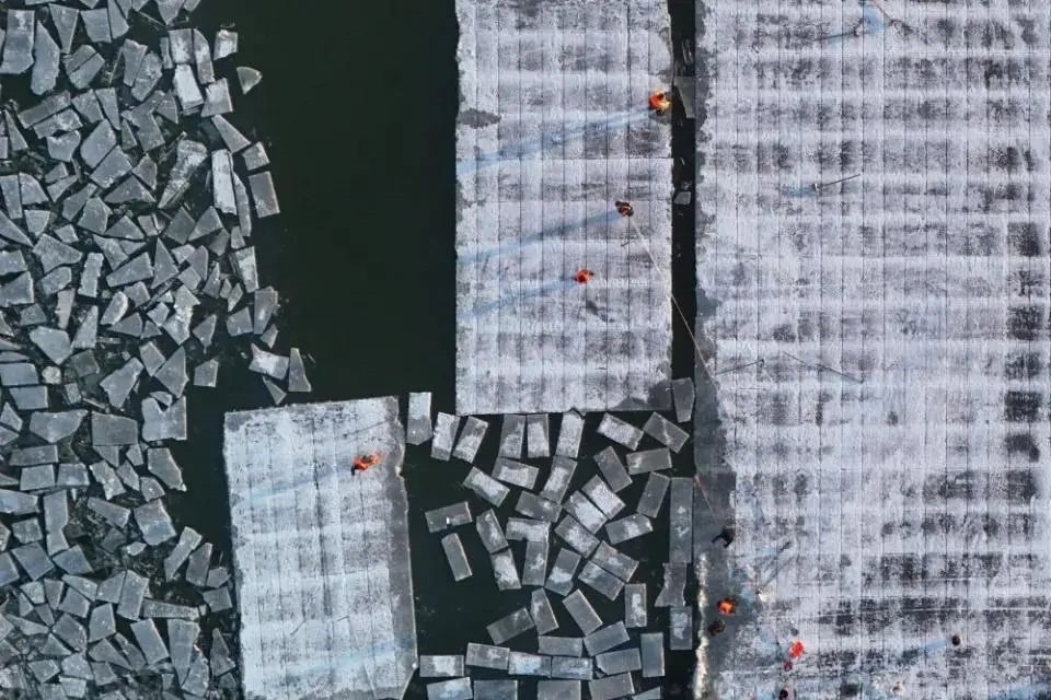 工人在松花江上的采冰現(xiàn)場進(jìn)行采冰作業(yè)。圖源:新華社