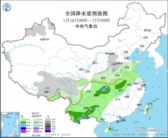 全國降水量預(yù)報(bào)圖(1月14日08時(shí)-15日08時(shí))