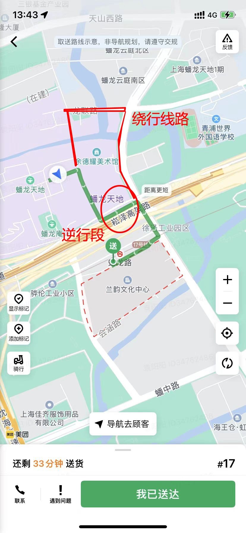 △出了寶山新業(yè)坊若是向北送餐,美團(tuán)騎手的后臺(tái)界面可以看到系統(tǒng)規(guī)劃的就是逆行路線。