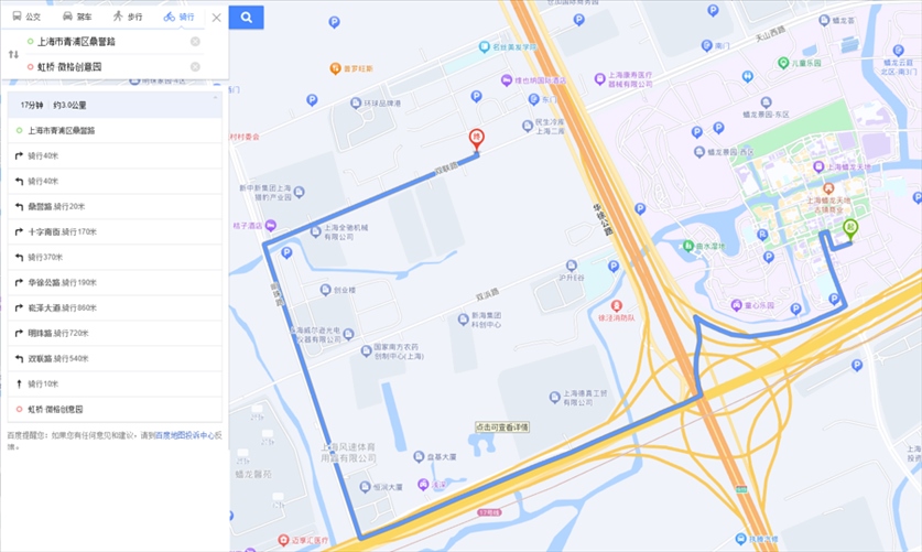 “途經(jīng)滬青平公路時(shí),平臺(tái)也愛規(guī)劃逆行路線?!标愱?yáng)陽(yáng)提供的第3條逆行路線正屬于這一情況。這是從京華路187弄送往南山雨果小區(qū)的一單,平臺(tái)規(guī)劃的路線中,指示騎手從明珠路右拐進(jìn)入滬青平公路向西騎行至葉聯(lián)路再向南。可是,滬青平公路在葉聯(lián)路路口處沒有過街橫道線,此時(shí),平臺(tái)索性規(guī)劃騎手沿著滬青平公路南側(cè)逆向騎行。1月8日,記者實(shí)地走了一遍這段路線:若騎手沿著滬青平公路北側(cè)騎行,需一直向西騎到徐盈路才能過街,再沿著滬青平公路南側(cè)向東抵達(dá)葉聯(lián)路。手機(jī)顯示,繞行路線比美團(tuán)平臺(tái)規(guī)劃路線遠(yuǎn)了1.2公里。