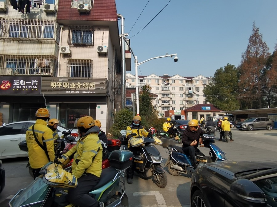△“寶山新業(yè)坊”商圈外賣業(yè)務(wù)集中,圖為騎手們正在等單。