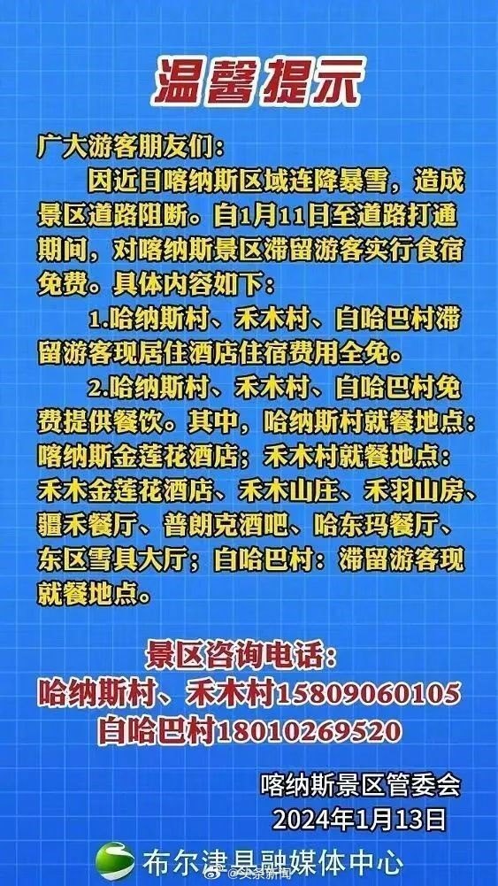 1月13日,喀納斯景區(qū)發(fā)布公告稱,對(duì)滯留游客實(shí)行食宿免費(fèi) 來(lái)源網(wǎng)絡(luò)