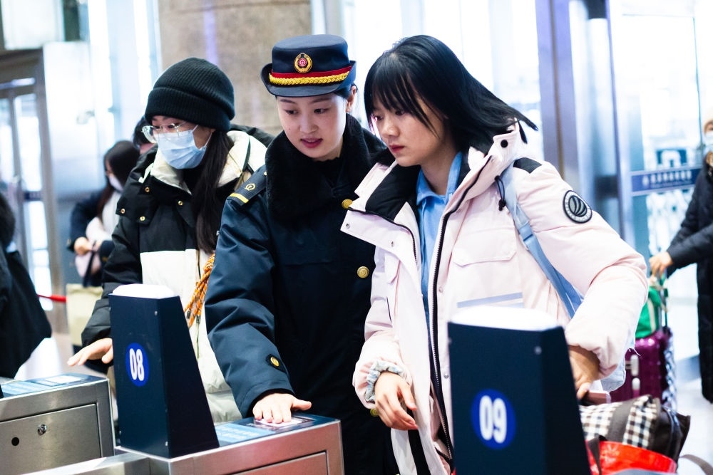 北京西站客運員協(xié)助旅客檢票進(jìn)站。新華社發(fā)(徐強(qiáng)攝)