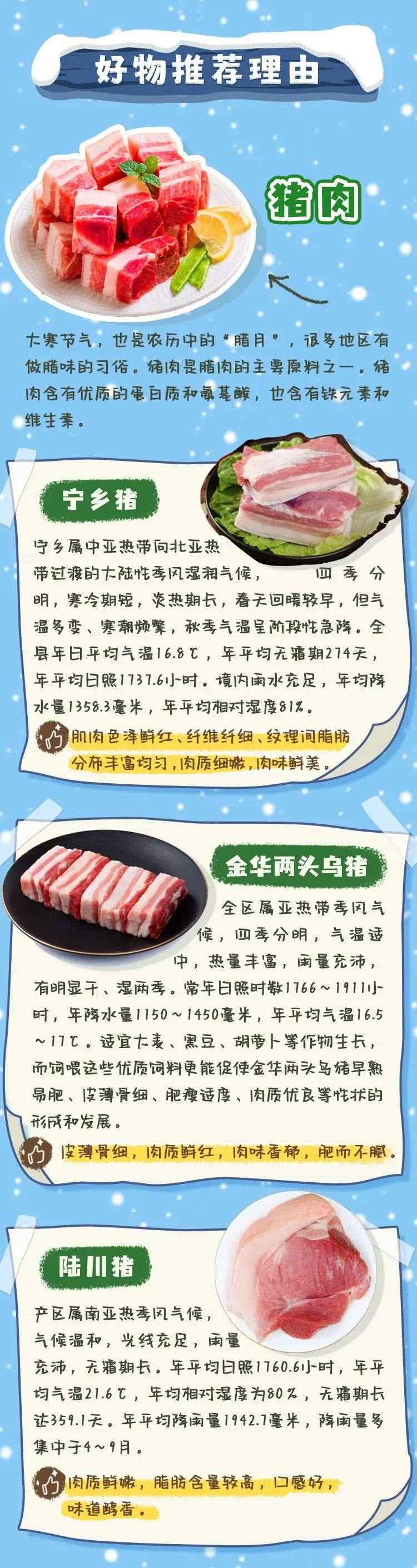 大寒節(jié)氣除了吃糯米飯外,還有一個習俗就是做臘肉、吃臘肉?!岸D風腌,蓄以御冬”,這個時節(jié),最適合風干制作臘味。豬肉,是臘肉的主要原材料之一。我國的養(yǎng)豬史,最早可以追溯到新石器時代,目前豬肉產區(qū)可以說是遍布全國,不同地區(qū)的豬肉也有不同的特色和風味。