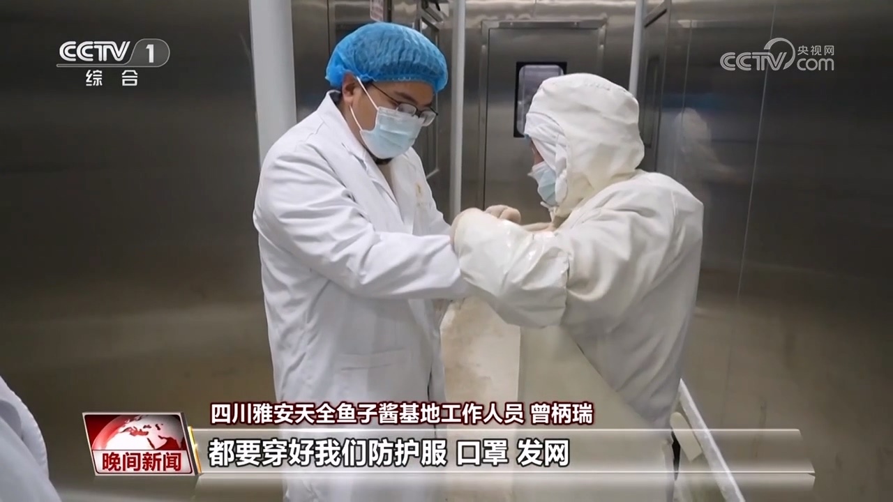 四川雅安天全魚子醬基地工作人員 曾柄瑞:每次進(jìn)加工車間都要穿好防護(hù)服、口罩、發(fā)網(wǎng),就像進(jìn)手術(shù)室一樣,經(jīng)過(guò)非常嚴(yán)格的消毒程序和控制,才能夠進(jìn)入加工車間。