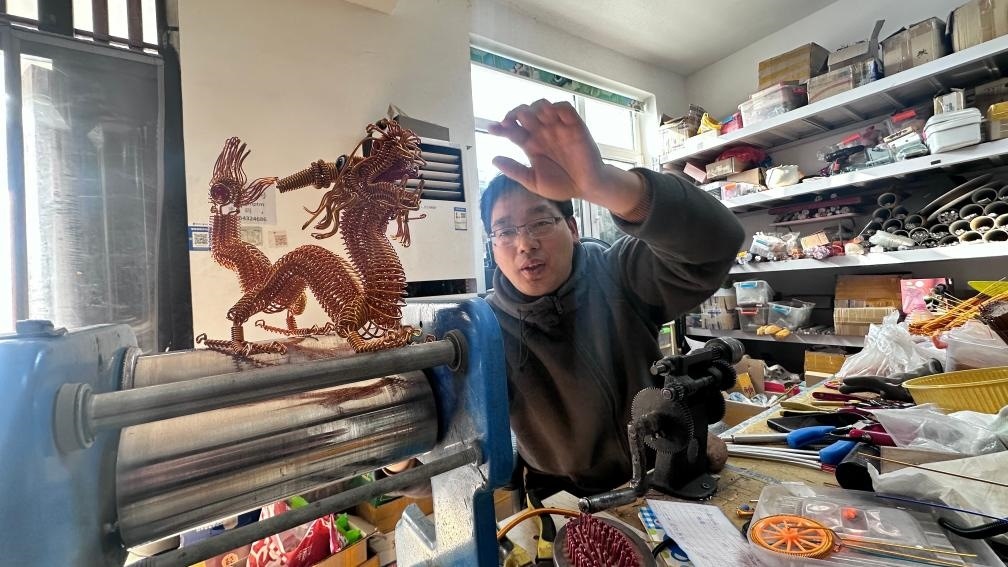 在村民楊訓(xùn)政不大的鋁編工作室內(nèi),簡易貨架上一排排銅色鋁線編制成的藝術(shù)品讓人目不暇接。一條條鋁制彈簧經(jīng)過村民巧妙處理后,成了工藝品市場的搶手貨:發(fā)財樹、恐龍、摩托車、機器人……“我這鋁編雖然產(chǎn)量低、規(guī)模小,訂單可已經(jīng)排到了今年10月底。龍年將至,來自海內(nèi)外的訂單讓大家年前忙得不亦樂乎?!睏钣?xùn)政一邊用鉗子擺弄著鋁編小龍,一邊告訴記者。