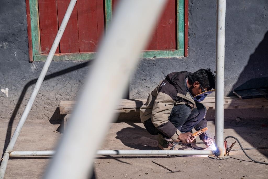 等待焊接的一會兒工夫,村里的孩子們也要跑來和嘎瑪群美踢兩腳