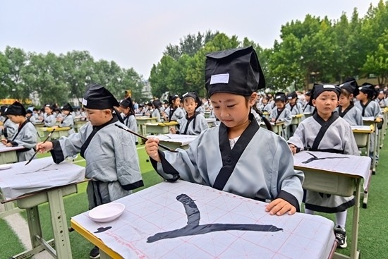 2023年9月1日,山東濰坊,青州市云門山路回民小學(xué),一年級新生用毛筆書寫“人”字。視覺中國供圖