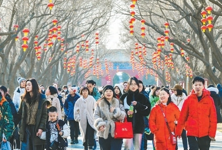 春節(jié)期間,天壇公園西天門內(nèi)掛滿紅燈籠,游客流連其間,感受新春熱鬧氣氛。 本報(bào)記者 鄧偉 攝